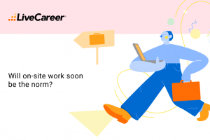 Infographic showing survey results: 60% believe more companies will require full-time in-office work, 31% anticipate fewer mandates, and 9% expect no changes, with the LiveCareer logo.